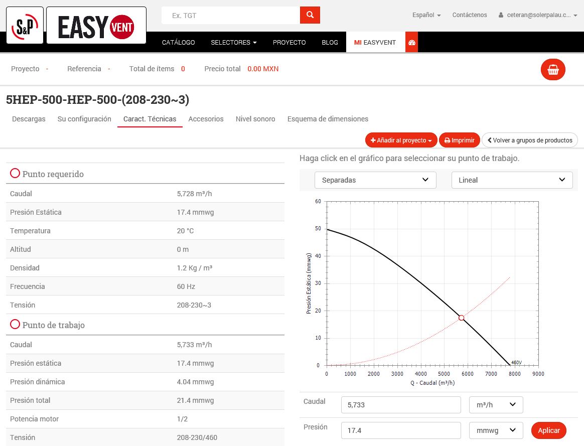 - Descripción detallada del producto seleccionado indicando el punto de funcionamiento real del producto.